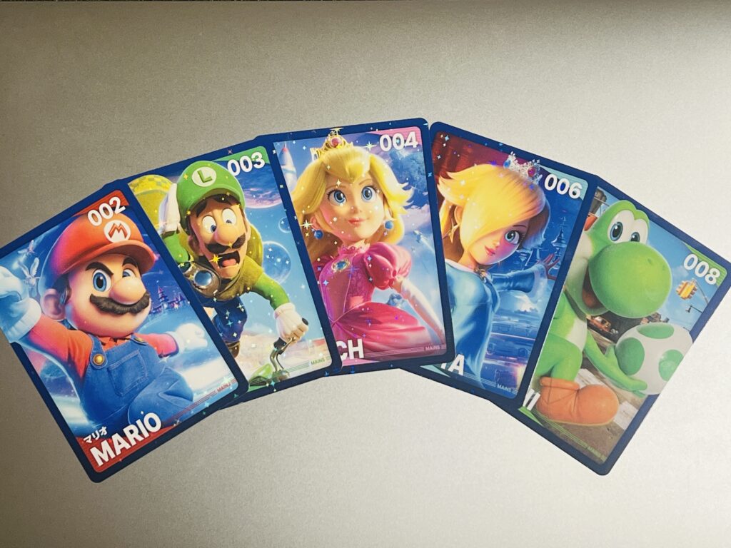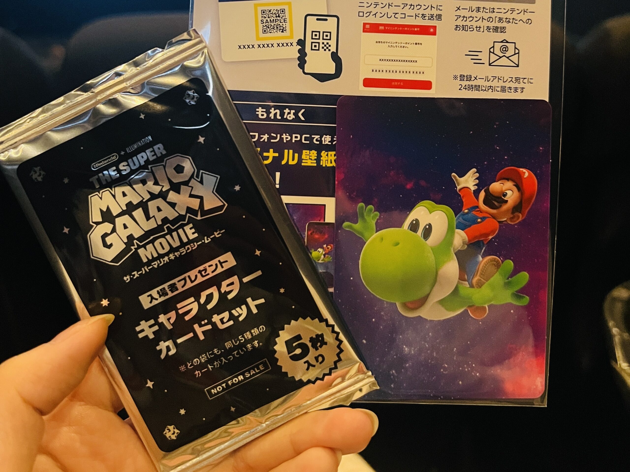 Every moviegoer receives the Entry Gift Vol.1: Character Card Set — a pack of 5 holographic cards featuring Mario, Luigi, Peach, Rosalina, and Yoshi 🎊 The holographic foil finish makes them shimmer and shine with every movement — they’re genuinely collector-worthy!