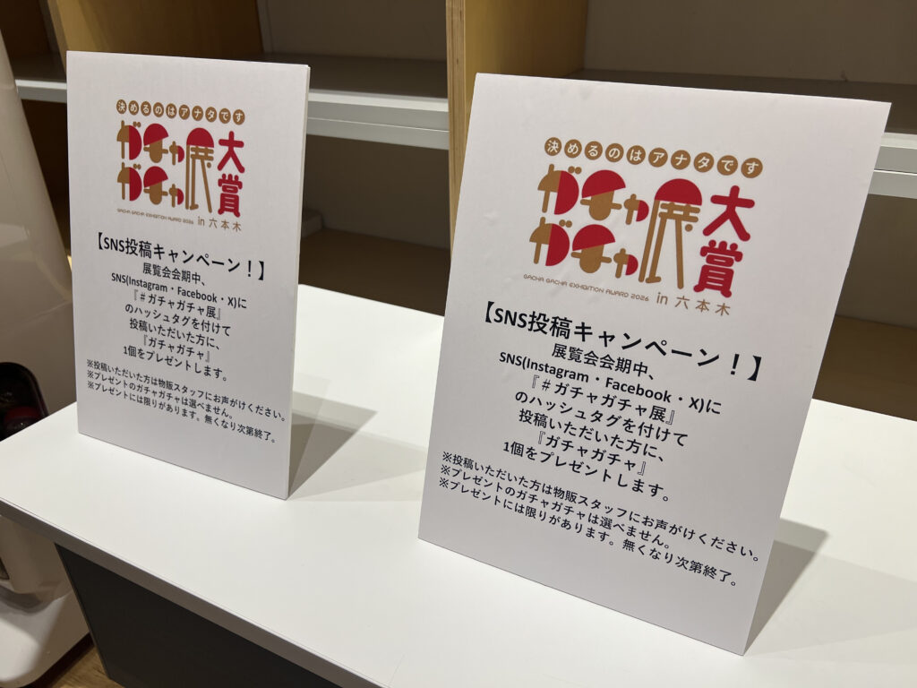 展覧会会期中に、SNS(Instagram・Facebook・X)に「#ガチャガチャ展」のハッシュタグを付けて投稿した画面を物販スタッフさんに見せると、なんと「ガチャガチャ」1個をプレゼントしてもらえるんだって!🎁🌈