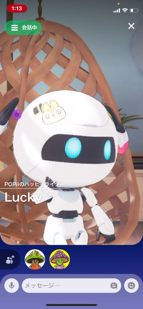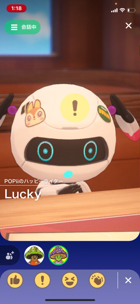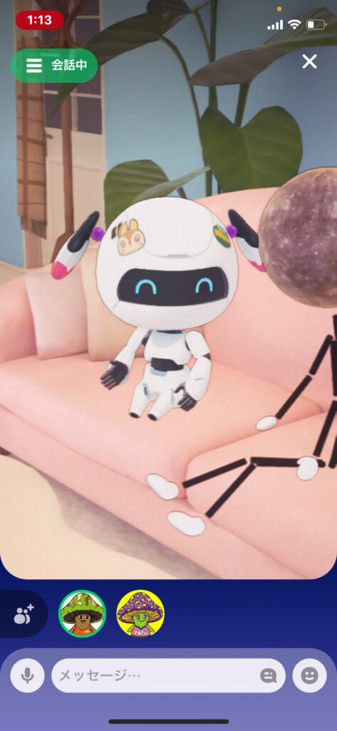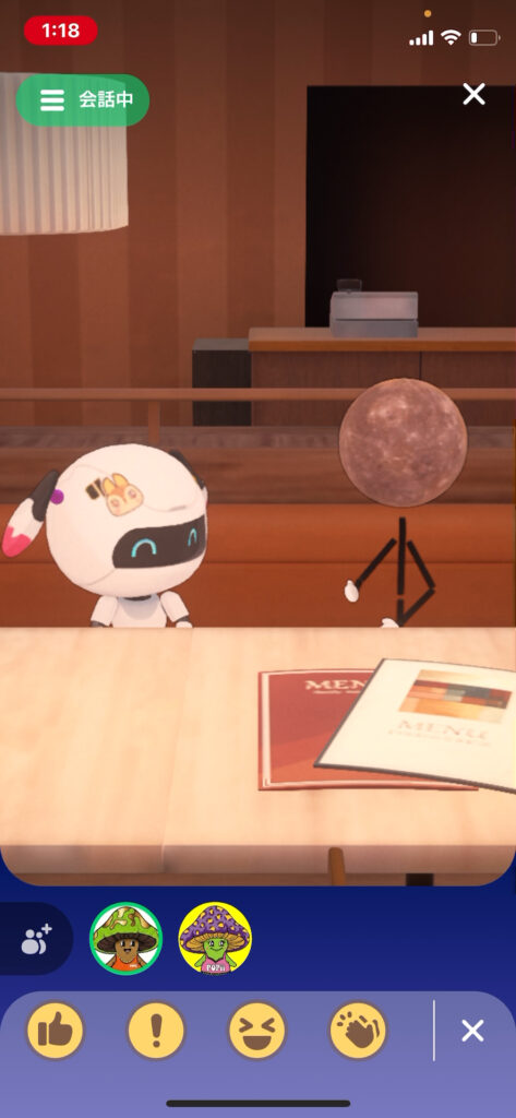 画面の中ではソファーに座っておしゃべりするんだけど、ポジションは自動で決まるから楽ちん!(「リブングルーム」とか「ファミレス」とかの場所は選べるよ)